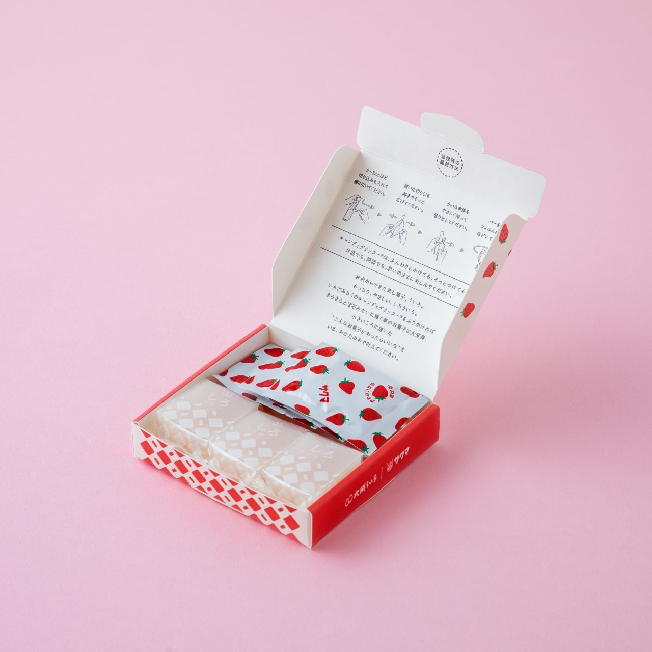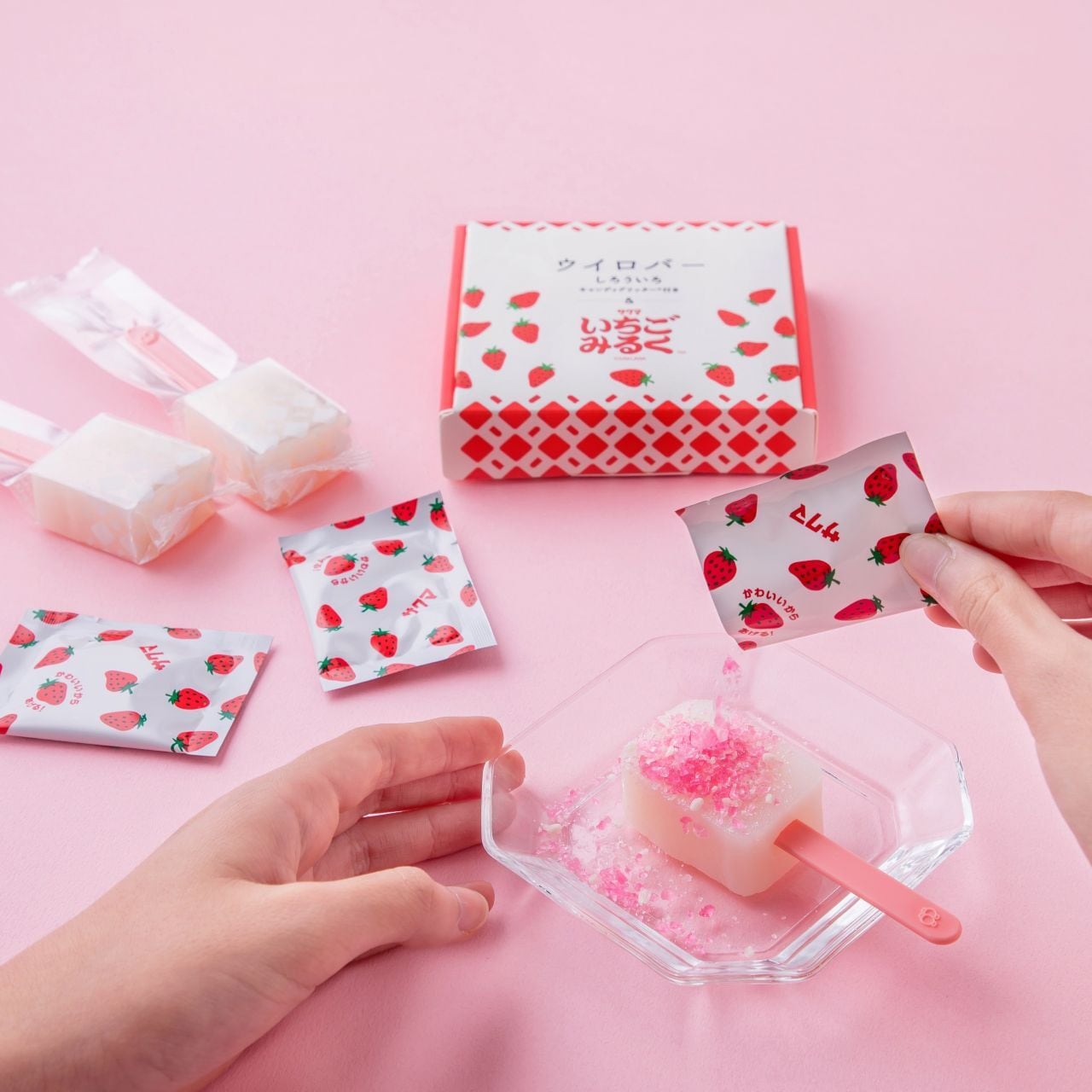 もっちりとしたしろういろに、いちごみるく味のしゃりしゃりとしたキャンディグリッター®をふりかけ、食感の重なりをお楽しみいただけます。