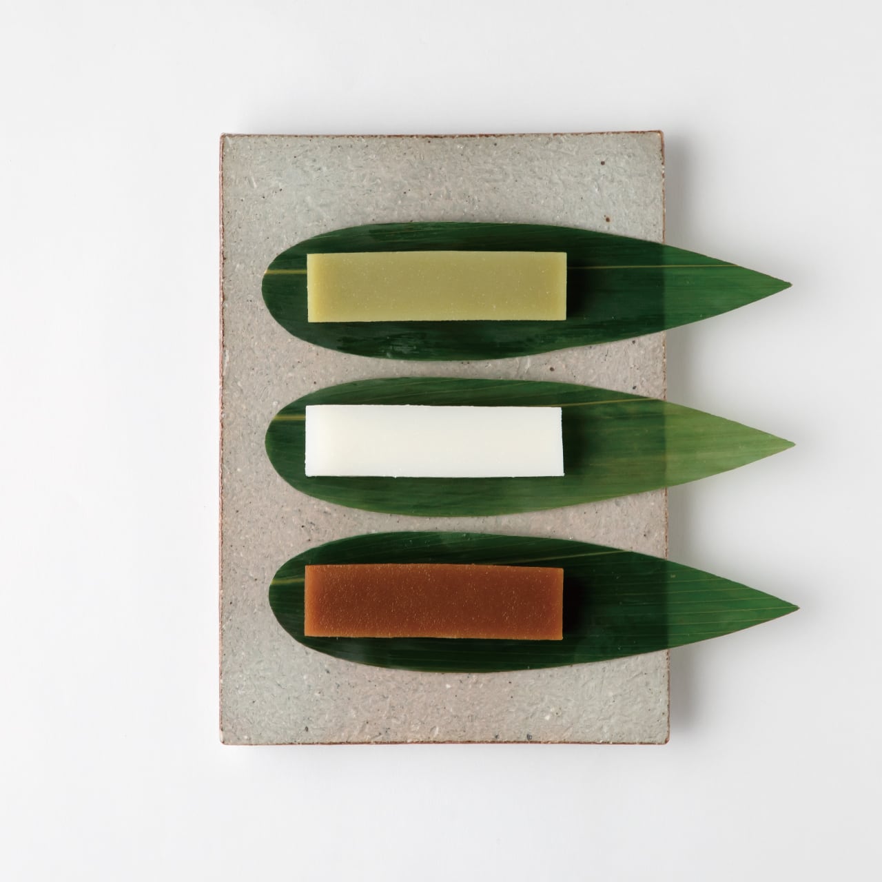 抹茶・白・黒、三つの味のういろを笹の葉で包み、ひと口サイズに仕立てました。
